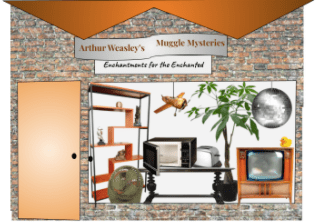 Arthur Weasley’s Muggle Mysteries is a shop selling enchanted muggle items, specializing in electronics. It began after the war as a small section of Weasleys’ Wizard Wheezes, but the popularity soon earned its own storefront. He retired from the ministry to work at the shop full-time.