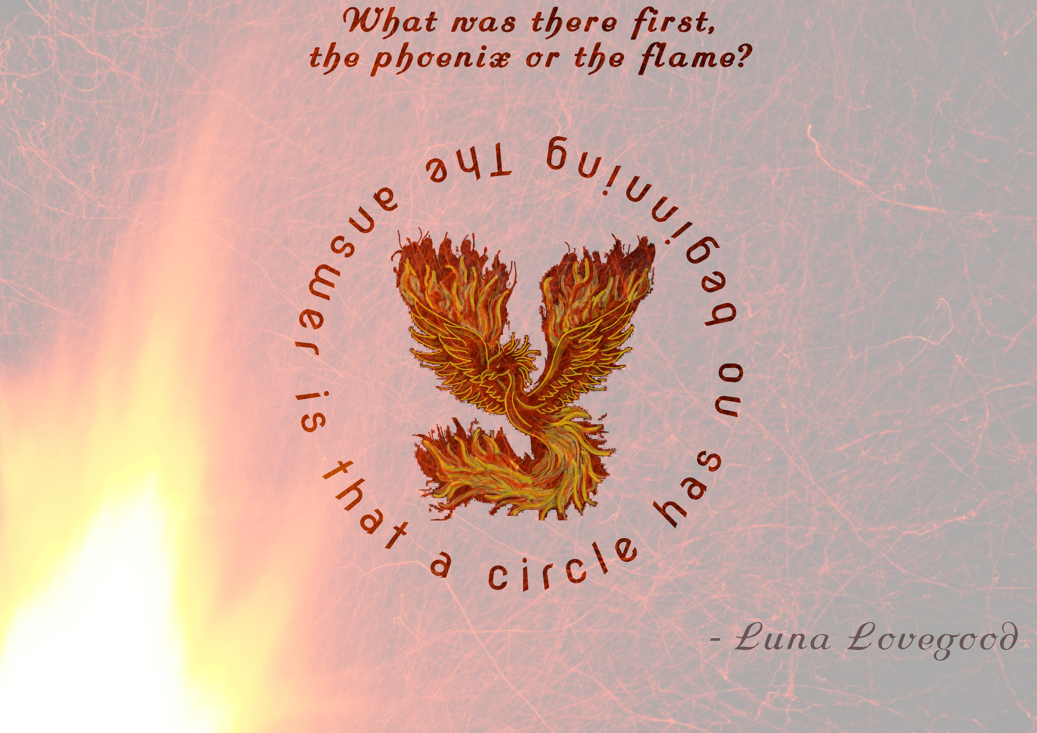 “Golden threads bound // Phoenix song surround // Friends and family rose again, // their bodies made of the densest smoke, // Though it was only for a moment, // enough to let the boy pull away // And escape the dark lord once more”